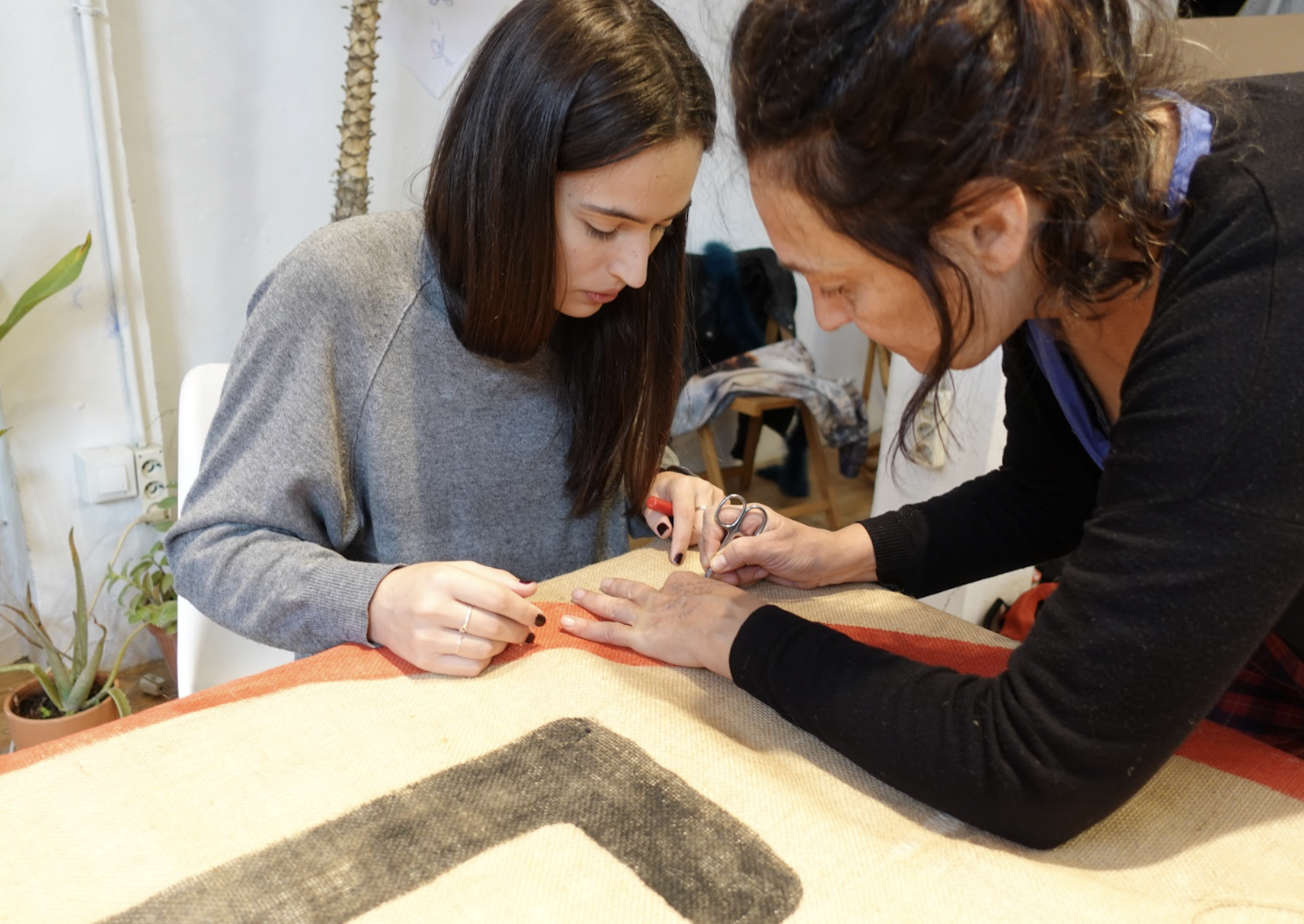 Otro día. Coser. Unir las telas. Servirse de los hilos. La costurera Rosa Solano estuvo una mañana con nosotros. Confeccionando, dejando listos los bordones para que el mensaje se sostuviera, dando las puntadas, cortando hebras, anudando saberes.