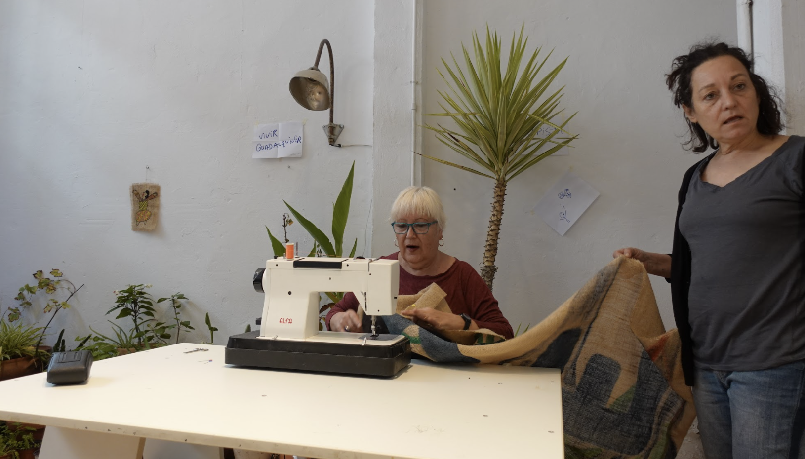 La costurera Rosa Solano cosiendo las pancartas de arpillera