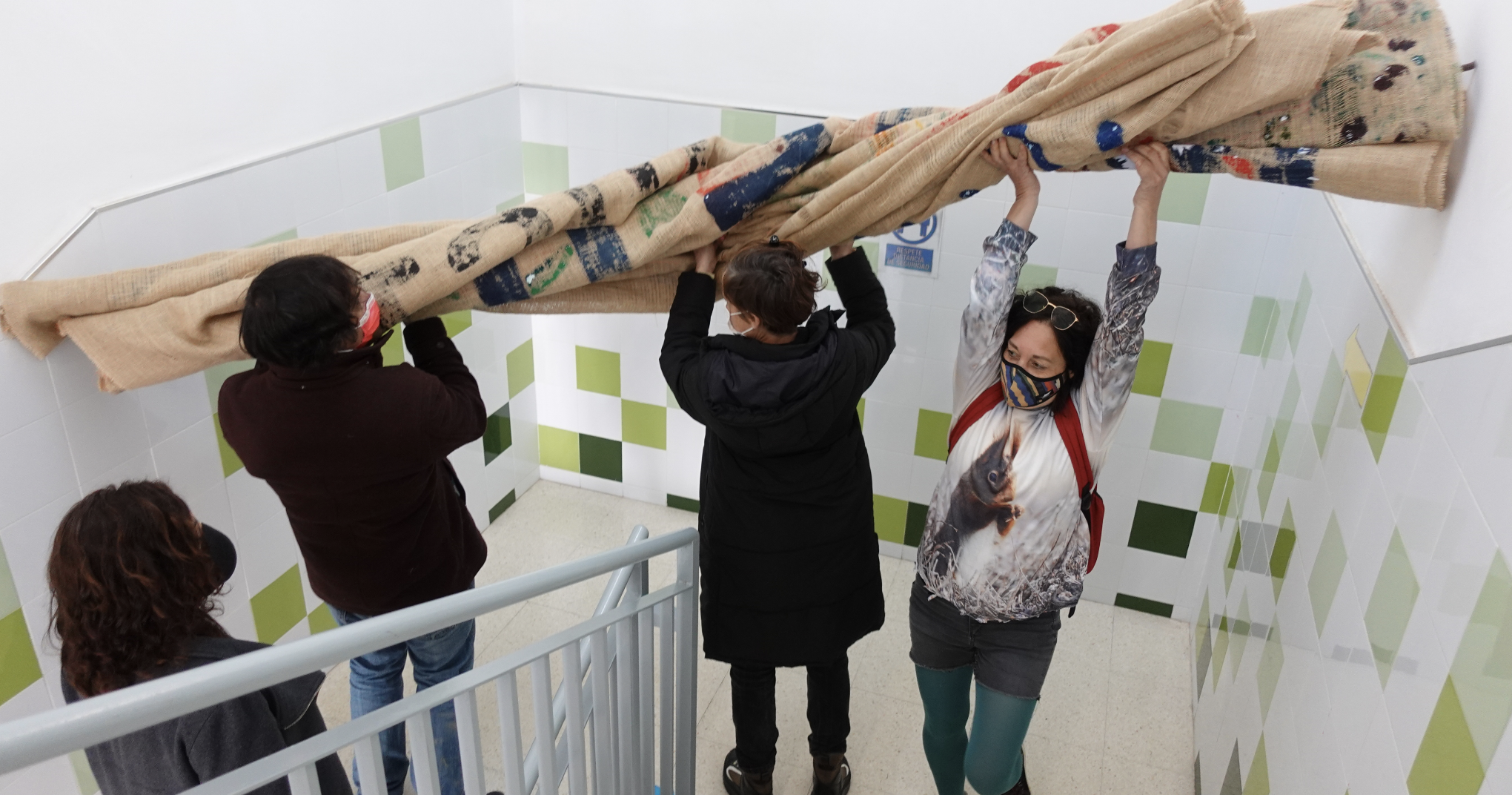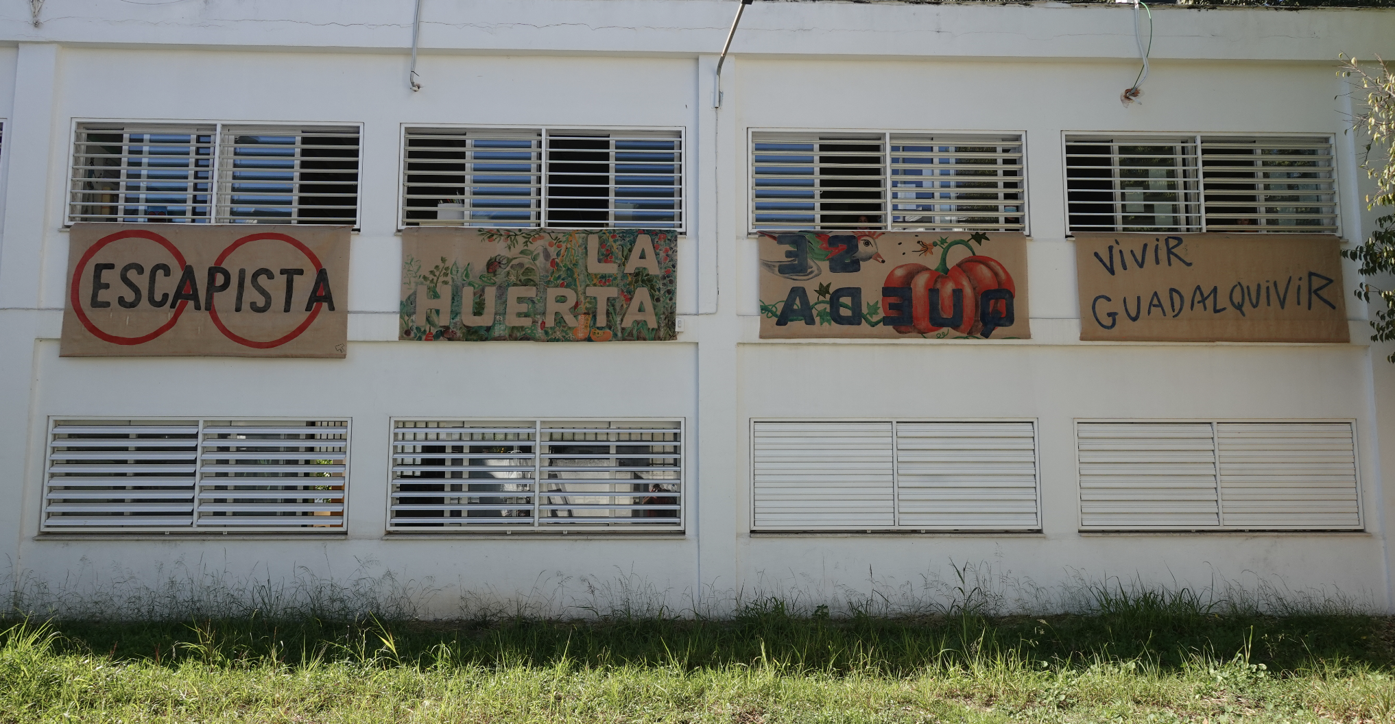 Tere empezó a trabajar los diseños sobre la arpillera. Pero lo primero fue abrirla. Había que dejar que pasara el aire para que el viento no las rasgara. De la mano de Nuria y Ana, con mucha paciencia y cuidado, se abrieron ojales muy pequeños, ojales por donde iba a pasar el viento. Después, empezaron los diseños. Durante varios días, la arpillera se fue llenando de colores. “Escapista”, una llamada a la atención para que nadie se fugue de la nueva complicidad. “El huerto/se queda”, porque un huerto en una escuela debe ser un lugar para siempre. Y, por último, “Vivir Guadalquivir”, el nombre de la acción de Tere dentro del proyecto ¡Vives en una Ciudad Agrícola!.