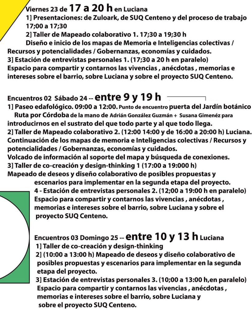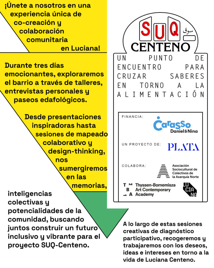 A veces es un pequeño ajuste, detalle o solución creativa que añade a un proyecto algo que lo hace irresistible.A menudo, la perspectiva de un artista (o de un colectivo de artistas) puede abrir una puerta a dimensiones que antes eran invisibles. Una conexión, o un puente, hacia una isla común donde las ideas pueden crecer en múltiples direcciones añadiendo profundidad y oportunidades para ampliar las condiciones en nuestros espacios más cercanos. Trabajar de manera procesual y con los artistas en comunidad es una de las líneas de investigación que nos gustaría explorar dentro del proyecto Suq Centeno. Para ello ponemos en marcha una serie de residencias de artistas para conseguir que el Suq se vaya expandiendo en el barrio. La primera residencia será con Zuloark, una oficina distribuida de arquitectura, urbanismo y cultura fundada en 2001 en Madrid, con sedes en Berlín, Coruña, Bolonia, Atenas y La Palma. Entre los proyectos que han realizado cabe destacar el proyecto social del Campo de Cebada en Madrid (2014), por el que recibieron el premio Best Practice de la ONU en el Dubai International Award by UN Habitat. Zuloark! del 23 a 25 de Febrero. Estas todes invitadas a participar!
